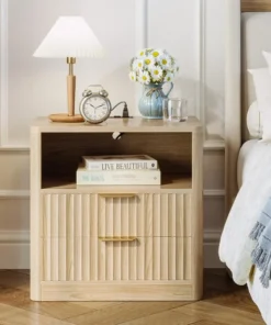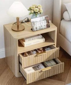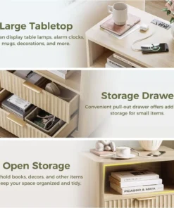 Fluted Night Stand Set Of 2, Modern Nightstand With Charging Station, Drawers And Open Shelves-Bedside Table For Bedroom