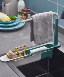 • The Telescopic Sink Shelf is a convenient kitchen accessory that helps to organize your kitchen sink area.