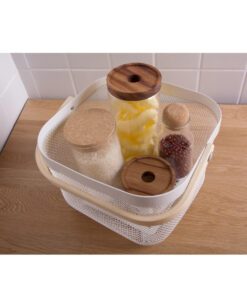 Hollow fruit basket, large capacity design, wooden handle, smooth and durable, simple and practical in shape.