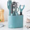 The knife rack is designed to securely hold and organize knives, providing a safe storage solution. It typically features slots or compartments of different sizes to accommodate various types of knives, keeping them organized and preventing accidents or damage.