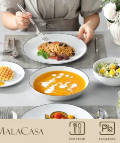 ● MALACASA dinner service sets are made of ivory white porcelain, FDA certified lead and cadmium free for everyday use. With classic square shape, making the dining table beautiful and elegant.